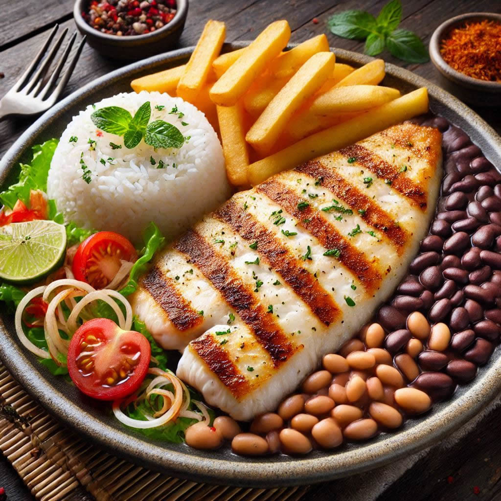 Filé de Peixe grelhado no tempero caseiro, leve e saboroso, acompanhado de arroz branco, feijão preto, batata frita crocante e farofa. Uma opção saudável e equilibrada, ideal para quem busca sabor e qualidade em cada refeição.