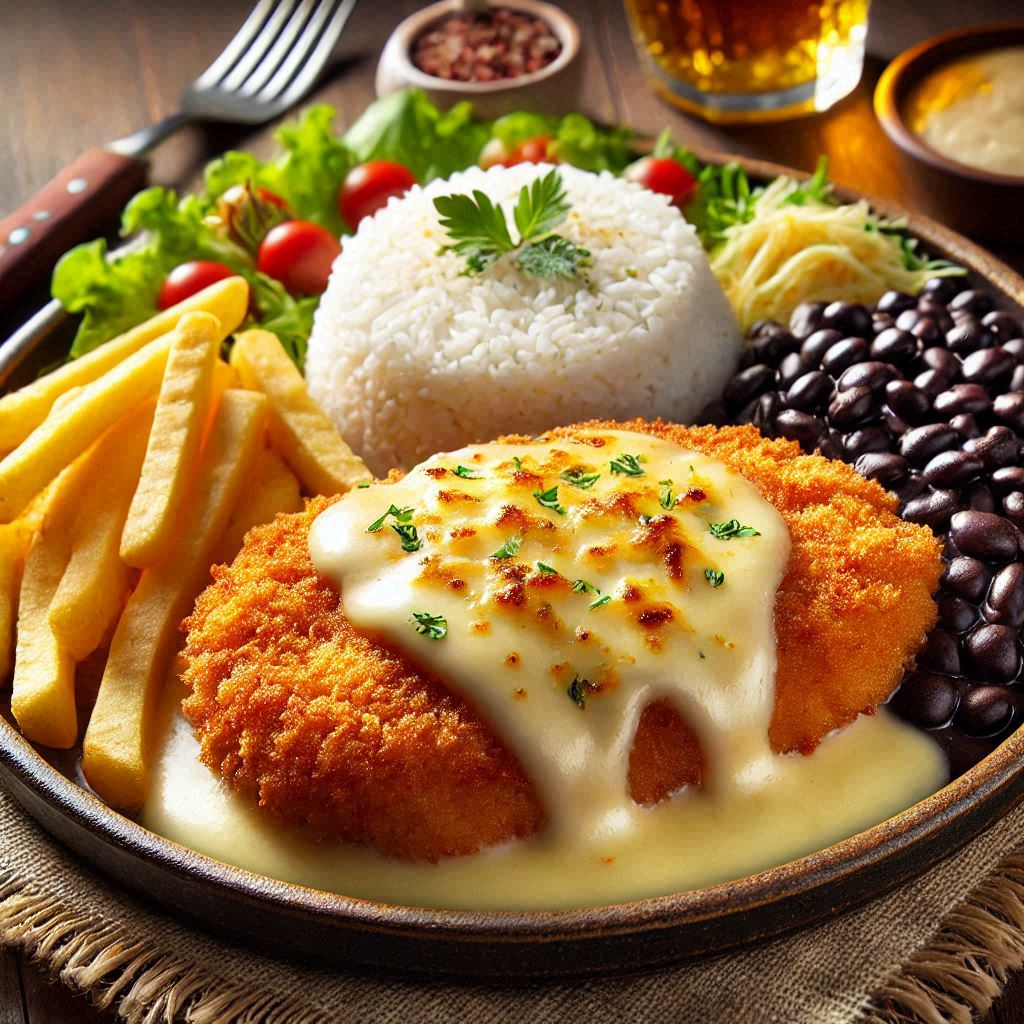 Iscas de Contra-Filé, Iscas de Peito de Frango, Linguicinha Mineira, Arroz Branco, Feijao Preto, Batata Frita Palito, Farofa e Molho a Campanha.