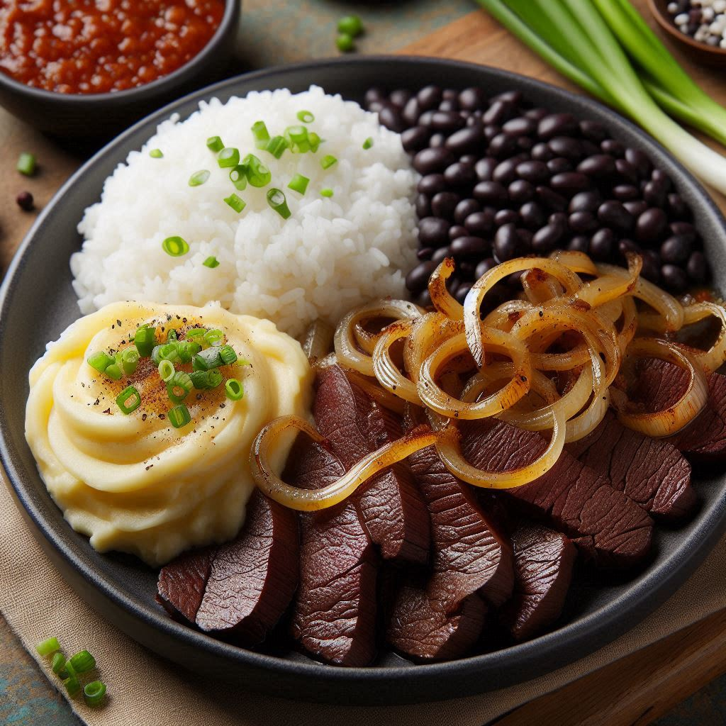 Iscas de Fígado Aceboladas acompanhando arroz branco, purê de batatas e feijão preto. Uma fonte muito rica em proteínas de alta qualidade, vitaminas e minerais com aquele toque da comidinha caseira.