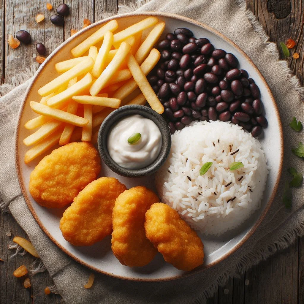 Nuggets de frango empanado crocante. servido com arroz branco, feijão preto, batata frita e farofa.