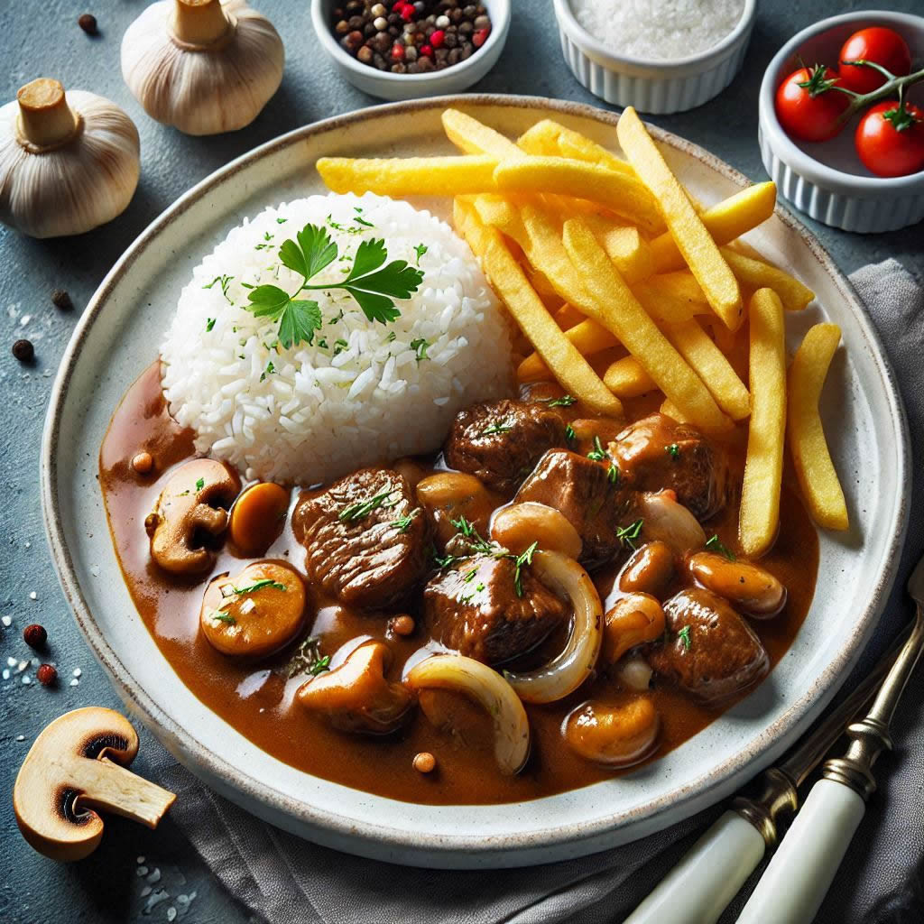 Strogonoff de Carne (120g) + Arroz Branco (220g) + Batata Frita Palito ou Purê de Batatas (90g)