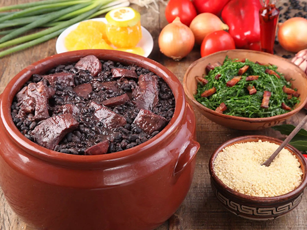 Feijoada com Carne Seca, Bacon, Lombo, Linguiça, Costela (250g) + Arroz Branco (220g) + Couve Mineira Refogada com Alho (120g) + Farofa (30g) + Vinagrete (60g)