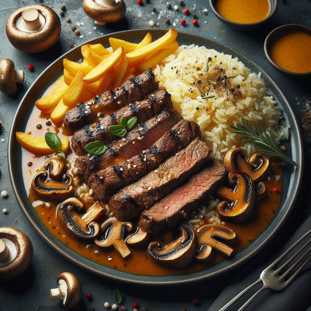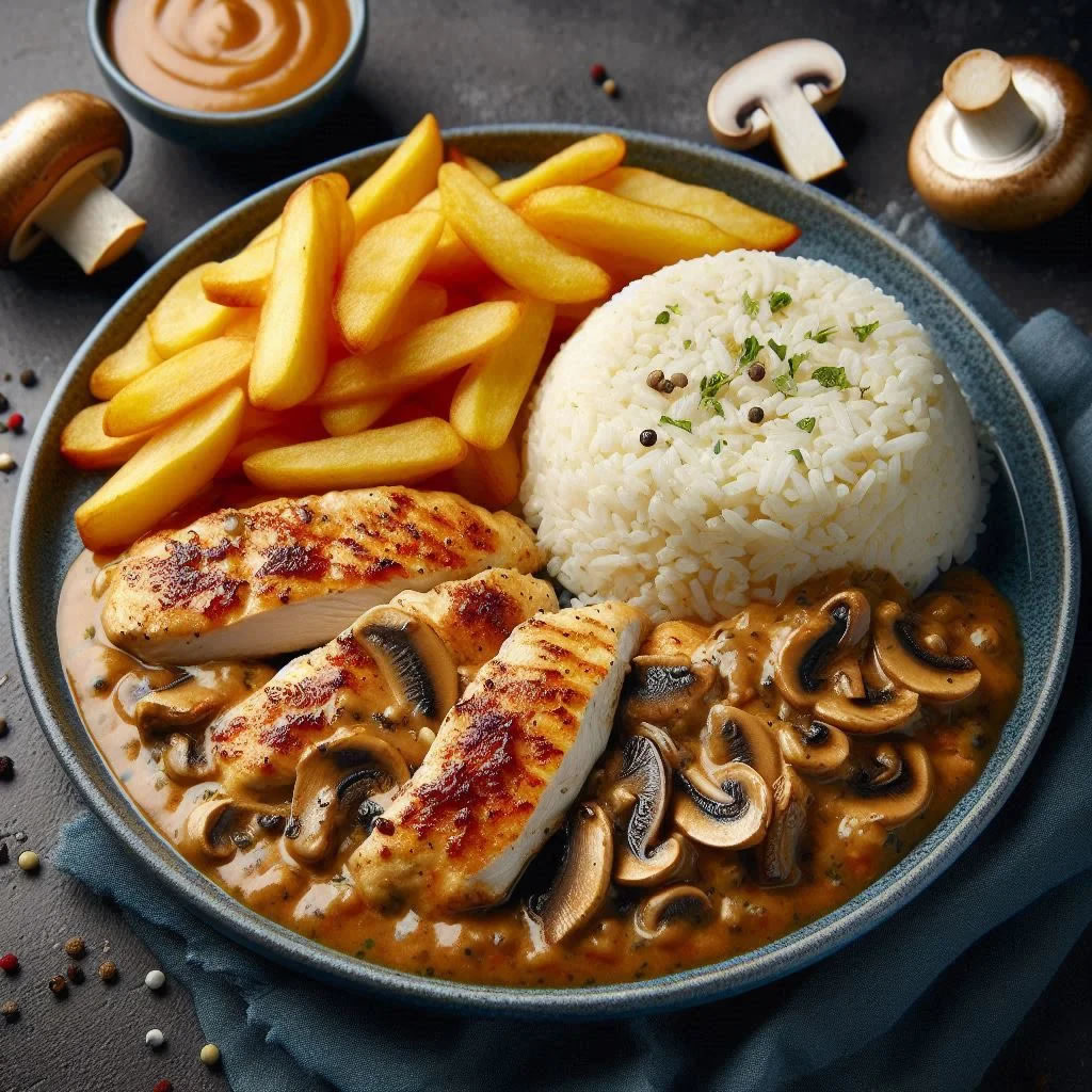 Escalopinhos com molho madeira e champignon acompanhando arroz à piamontese e batata frita.