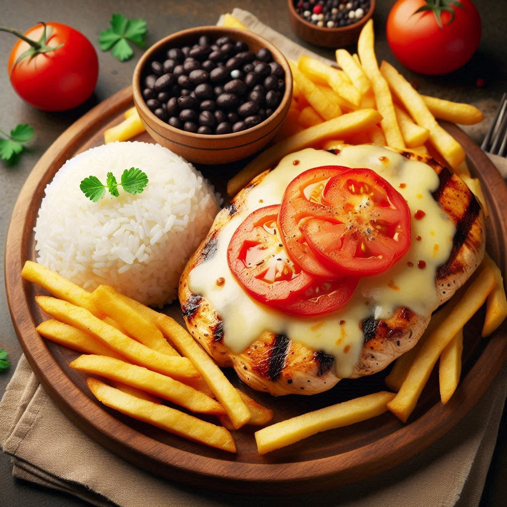Peito de frango grelhado coberto de queijo derretido e rodelas de tomate, acompanhando arroz branco, feijão preto, batata frita e farofa da casa.