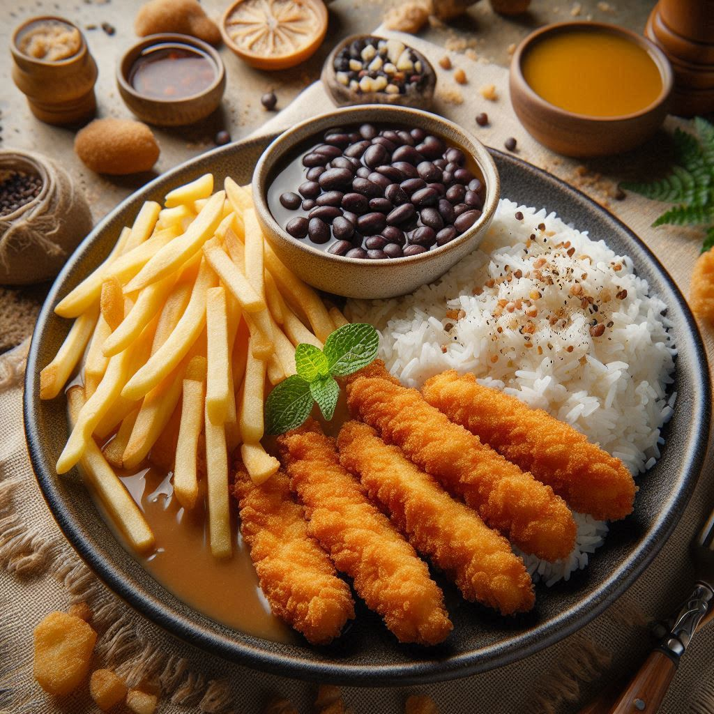 Iscas de peito de frango à milanesa, acompanhando arroz branco, feijão preto, batata frita e farofa da casa.