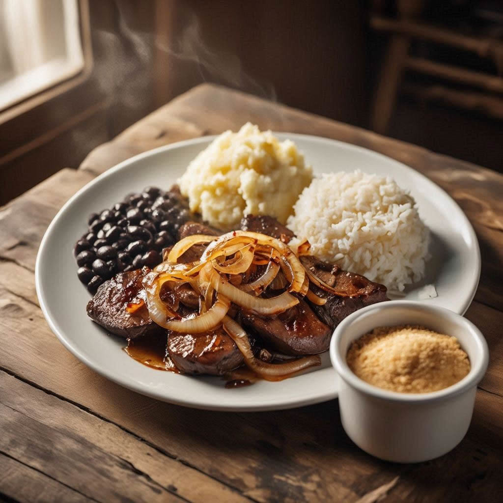 Iscas de Fígado Aceboladas acompanhando arroz branco, purê de batatas e feijão preto. Uma fonte muito rica em proteínas de alta qualidade, vitaminas e minerais com aquele toque da comidinha caseira