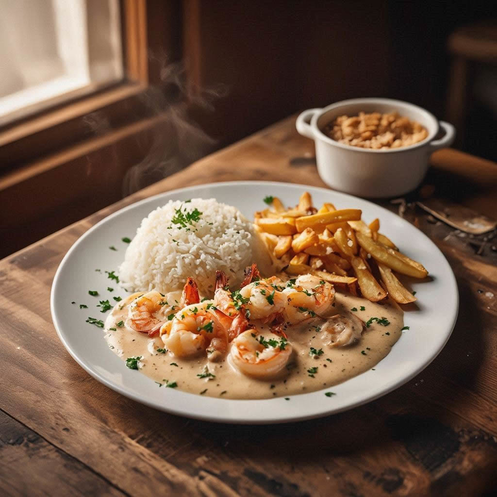 Camarões frescos no molho cremoso e delicado, com aquele sabor caseiro que conquista. Acompanha arroz branco soltinho e batata frita crocante. Uma refeição saborosa e especial, perfeita para quem quer algo leve e cheio de sabor.