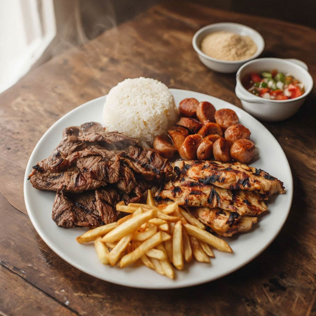Iscas de Contra-Filé, Iscas de Peito de Frango, Linguicinha Mineira, Arroz Branco, Feijao Preto, Batata Frita Palito, Farofa e Molho a Campanha.
