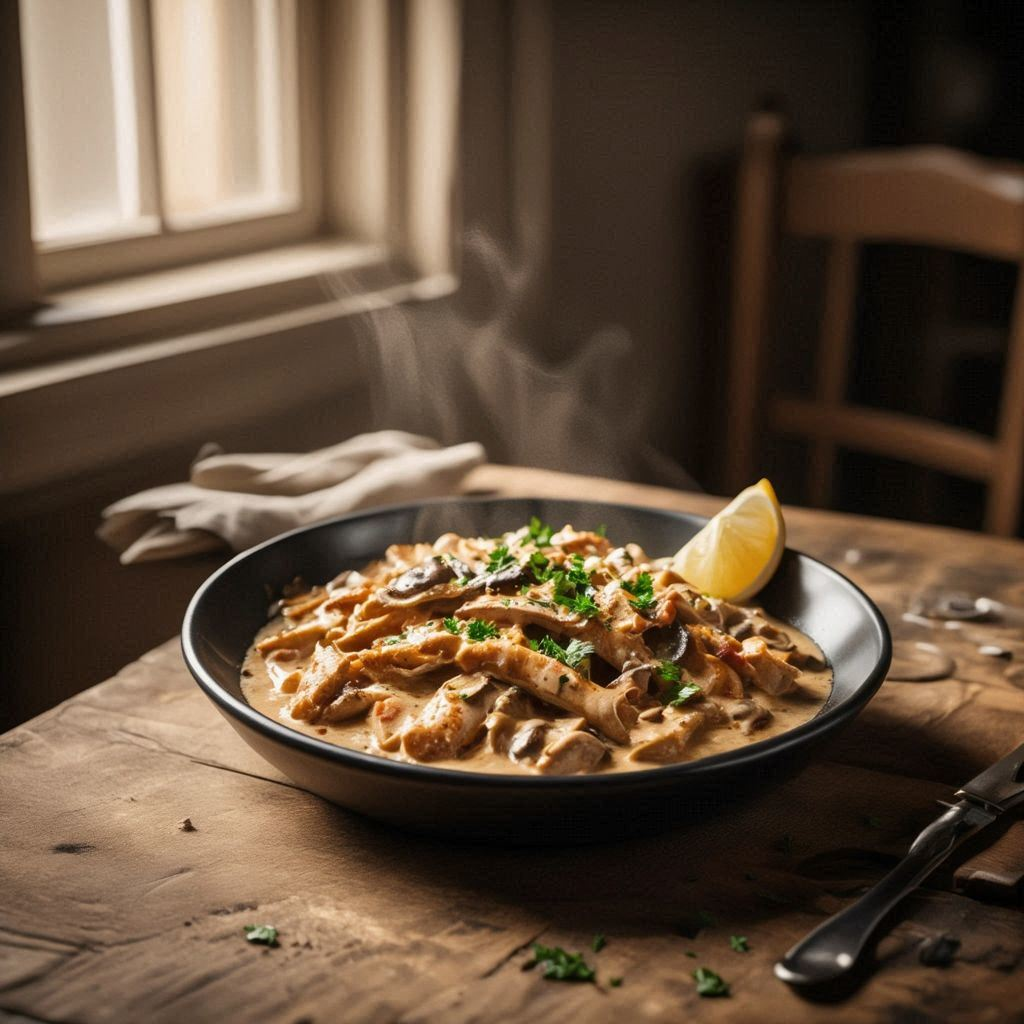 Peito de frango desfiado refogado, cenoura ralada, azeitonas pretas picadas, milho, maionese, coberto com batata palha.