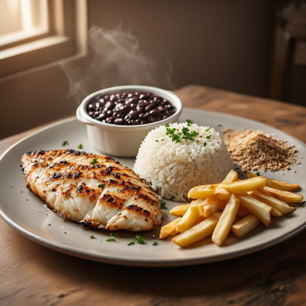 Filé de Tilápia grelhada no tempero caseiro, leve e saboroso, acompanhado de arroz branco, feijão preto, purê de batatas e farofa. Uma opção saudável e equilibrada, ideal para quem busca sabor e qualidade em cada refeição.