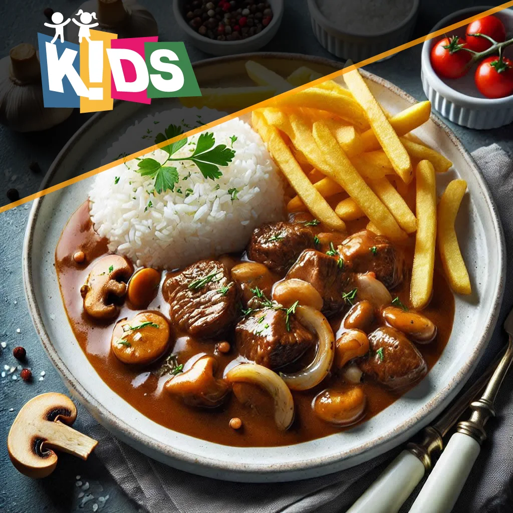 Strogonoff de Carne (100g) + Arroz Branco (160g) + Batata Frita Palito (100g)