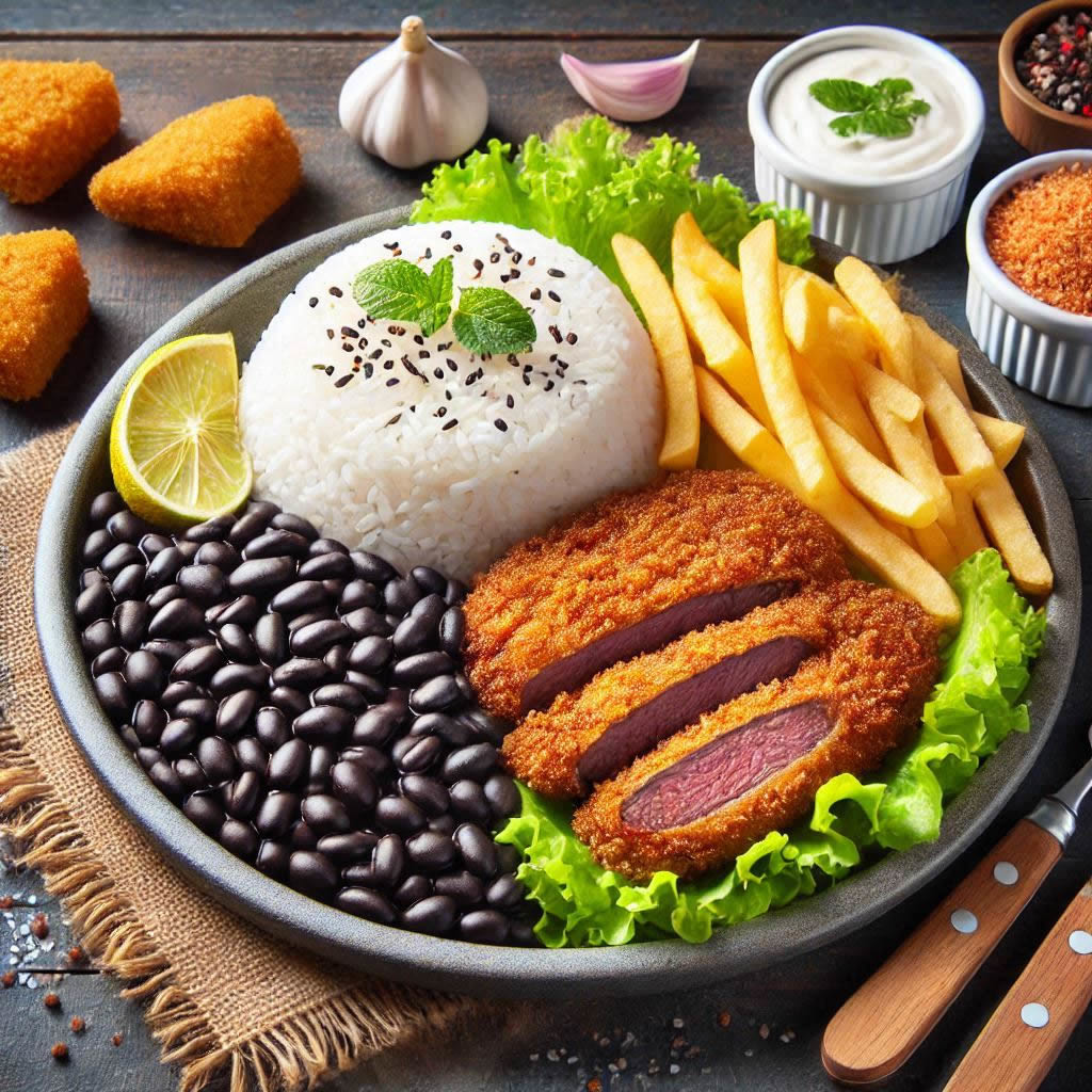 Baby beef macio e suculento, com fibras curtas que realçam o sabor, empanado na medida certa. Acompanha arroz soltinho, feijão temperado, batata frita crocante e farofa. Uma refeição completa e irresistível, com aquele toque caseiro que faz toda diferença.