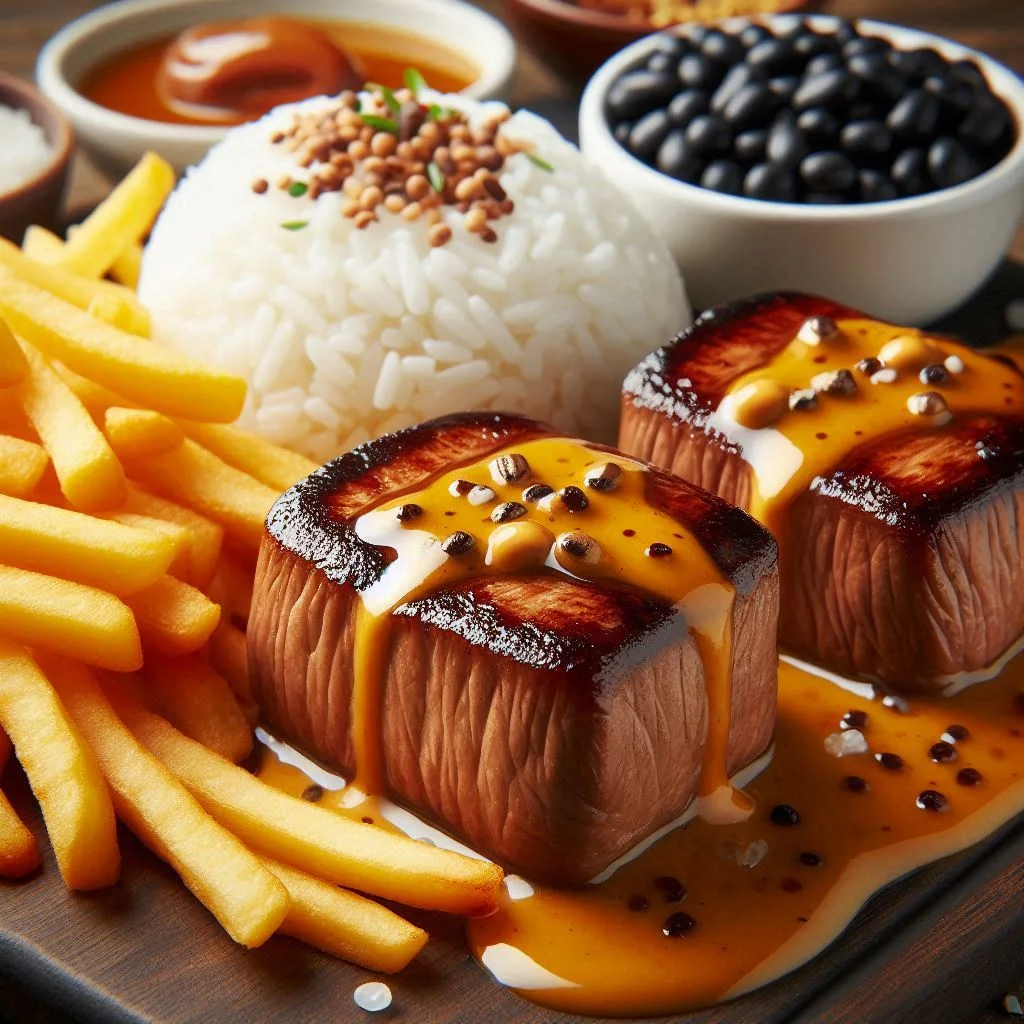 Medalhões de Mignon Suíno (120g) + Cobertura de Mostarda e Mel + Arroz Branco (220g) + Feijão Preto ou Carioca (130g) + Batata Frita Palito (90g) + Farofa (30g)